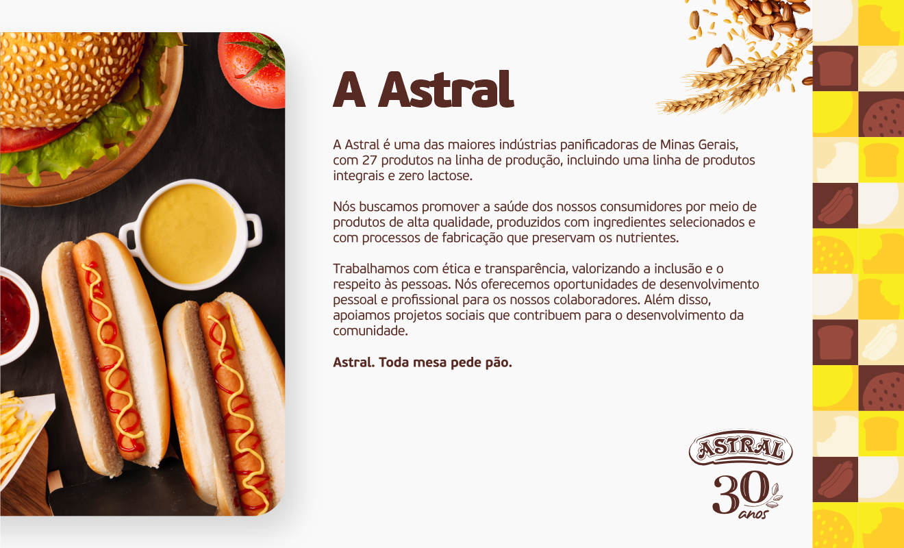 A Astral Pães é uma empresa de panificação e massas especiais com mais de 30 anos. Conheça um pouco da nossa história. Aqui, não apenas a contamos, mas também a criamos!